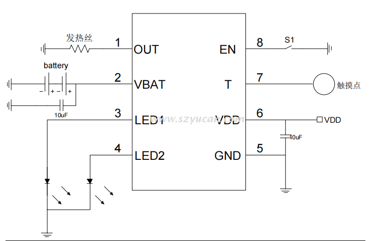 SM5101是一款針對電子點煙器的專用芯片,具有完整的充電功能和完善的電池保護功能,還具有觸摸控制開關(guān)。SM5101具有發(fā)熱絲短路保護功能,在負載電阻小于0。8Ω電阻時輸出截止。SM5101還具有省電模式,在省電模式下靜態(tài)待機電流小于1uA。SM5101具有完善的電池保護功能,具有過流、過壓、恒流、恒壓、溫度保護等功能。當(dāng)鋰電池充電電壓小于2。7V時為涓流充電,可以保證不損壞電池;當(dāng)鋰電池電壓大于2。7V后,開始大電流恒流充電;當(dāng)電壓接近4。2V時,充電電流逐步減小,充電電流小于一定閾值后,SM5101就截止充電。充電電壓檢測誤差可以做到±1%。SM5101具有觸摸檢測功能,其功能是用可變面積的按鍵取代傳統(tǒng)按鍵,可以減少外圍器件。